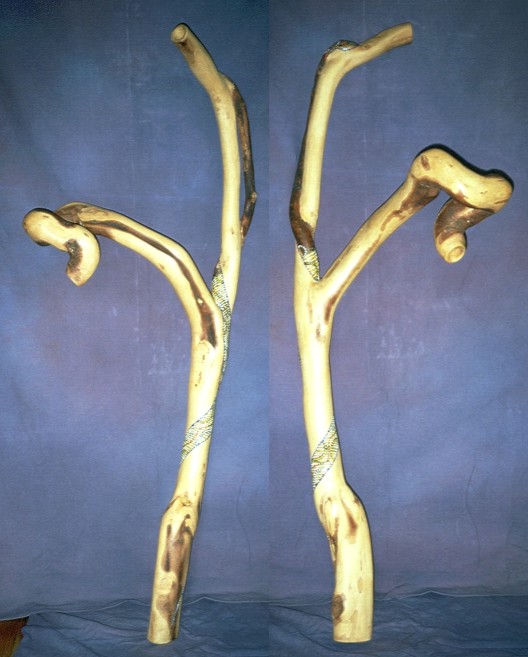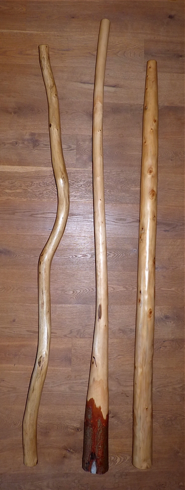 ![]() links: Flaumeiche aus Kaltern/Südtirol Stimmung: G, Länge: 194 cm, Ø 6,5/8 cm Preis: 680 €, verkauft Mitte: Haselnuß aus Schongau Stimmung: Ais, Länge: 207 cm, Ø 12 cm Preis: 700 €, mit einem Rosenquarz, verkauft Rechts: Tujastamm aus Großaitingen Stimmung: A, Länge: 188 cm, Ø 9 cm Preis: 600 € |