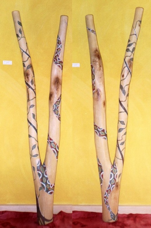 Doppeldidgeridoo aus Apfelholz Stimmungen:F,E,D#,D,C# Länge: 140cm, Breite: 40cm Schalltrichter: 11cm Preis: 1100 € |